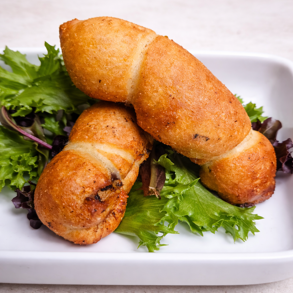Jerk Chicken with cheese wrapped in a flour dough and deep fried. 6 per order.