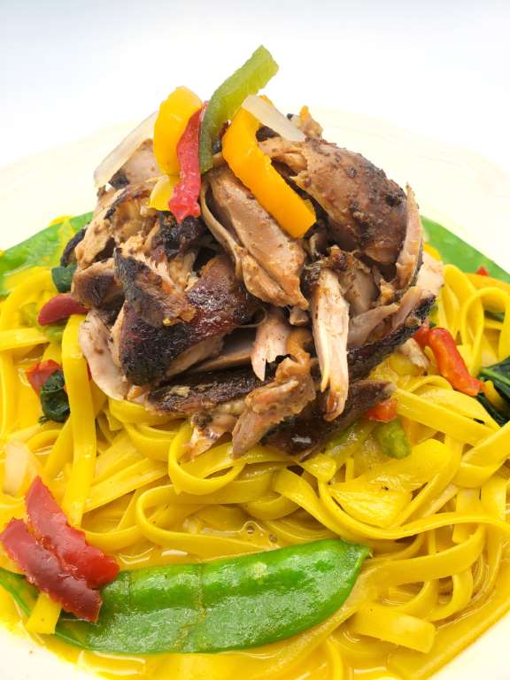 Fettuccine noodles and vegetables tossed in our in-house creamy coconut curry sauce, topped with our signature jerk chicken.