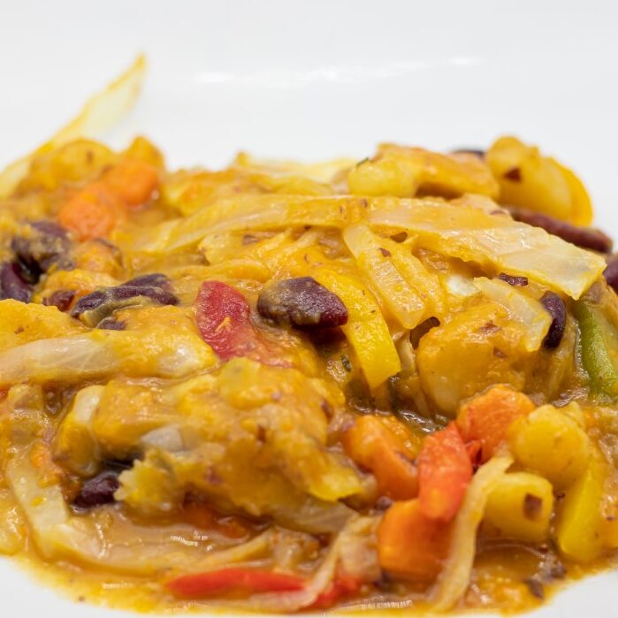 Pumpkin and other vegetables cooked into a stew with beans. Gluten-free.